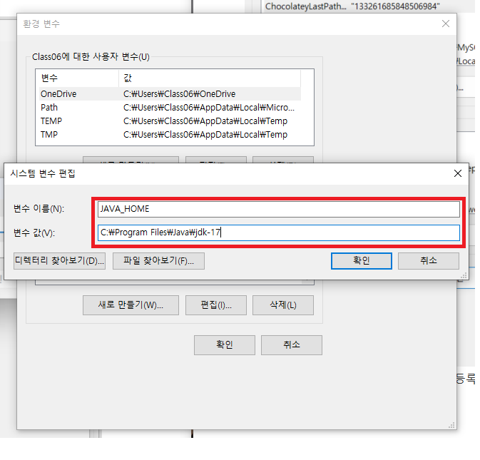| 변수 값 | 디렉토리 찾아보기 > C드라이브 > Program Files > Java > jdk-17 클릭 |