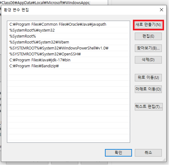 "새로 만들기 클릭" 후 "찾아보기" or %JAVA_HOME%\bin 입력